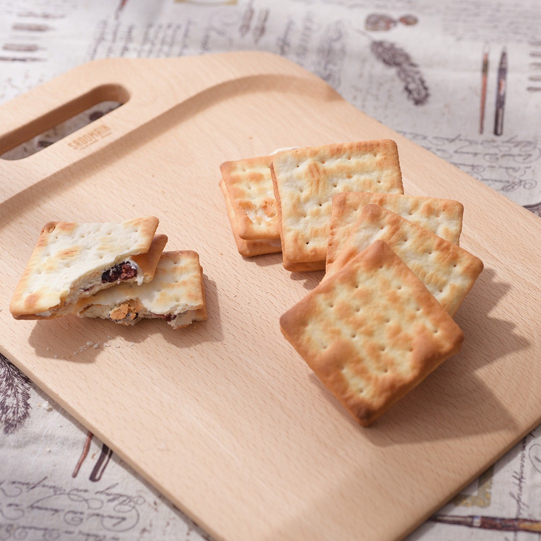 香酥的蘇打餅乾夾入香滑柔軟的蔓越莓牛軋糖,外酥內軟,淡淡的鹹餅香與豐富的蔓越莓牛軋糖內餡交織出幸福滋味~