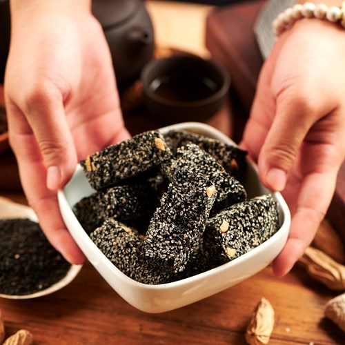 布田芝麻糖精選烏黑飽滿黑芝麻粒,減糖手工製作!芝麻香濃郁,酥脆不甜,回味無窮。