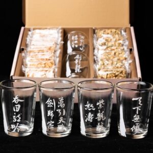 搭配臺式啤酒杯,杯身印有「萬引天殊劍歸宗」、「萬代河山滿江紅」、「天下無雙」、「吞日龍吟」、「紫龍捲怒濤」、「劍影紛紛」等招式(聯名啤酒杯共六款,隨機出貨),一口花生、一口啤酒,相揪摯友,乾杯有如過招,「共飲逍遙一世悠然」。