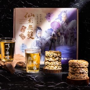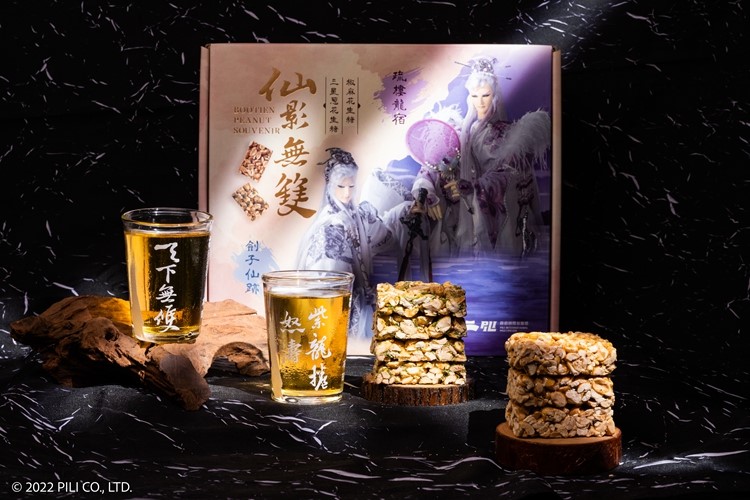 「仙影無雙聯名禮盒」以疏樓龍宿和劍子仙跡為發想,兩人是知心摯友,也是最佳損友,有一合招名為「仙影無雙龍翱騰」,布田花生特製「椒麻花生糖」和「三星蔥花生糖」,嚴選蔥界霸主宜蘭三星蔥,尋覓優質天然中藥材大紅袍花椒、青花椒、朝天椒,透過不斷測試,才讓花生×香蔥、花生×花椒,能夠相得益彰,雙雙出招,誰也不搶誰的味!另提供原味花生糖給不吃辣的朋友做選擇~