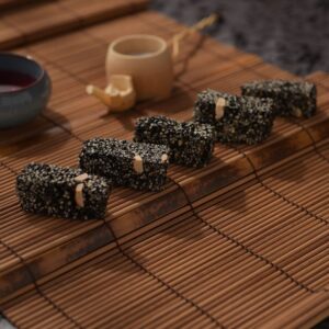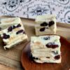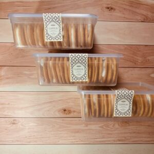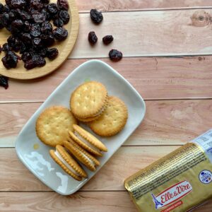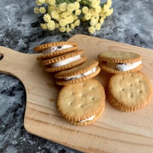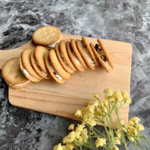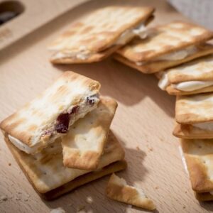 香酥的奇福餅乾夾入香滑柔軟的蔓越莓牛軋糖,外酥內軟,淡淡的鹹餅香與豐富的蔓越莓牛軋糖內餡交織出幸福滋味~